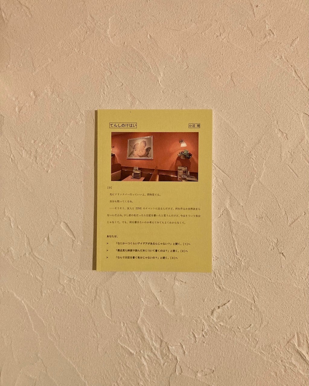 ドリンクバーを頼んで、何度でも雑談しよう。「サイゼリヤで架空の雑談をする」という設定の、ゲームブック形式のZINEです。選択肢によって会話が分岐し、展開が変わっていきます。雑談の内容はホックニーがiPadで描いた絵、天才てれびくん、『ドゥーム・ジェネレーション』、日記を書くこと、『あらゆることは今起こる』、パレスチナ解放デモ、天使たち。