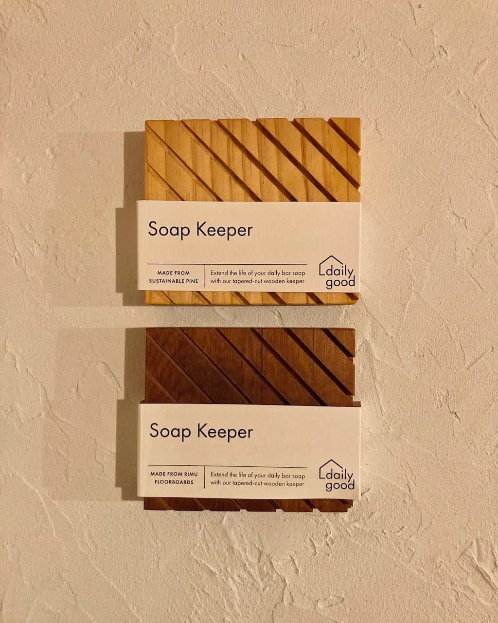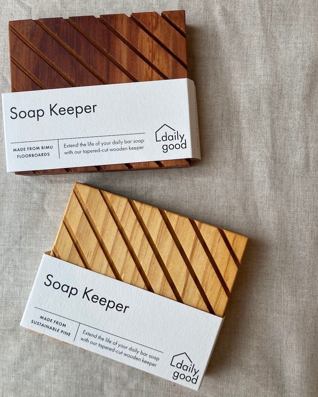 持続可能な方法で栽培されたパイン(松の木)や、再利用されたリムの木で作られたソープキーパーです。リムの木のソープーキーパーは、元々床の板として使われていて廃棄されたものをアップサイクルしたものです。リムの木はニュージーランドの固有種です。家具や建築用として、昔から大切な木材資源とされてきました。