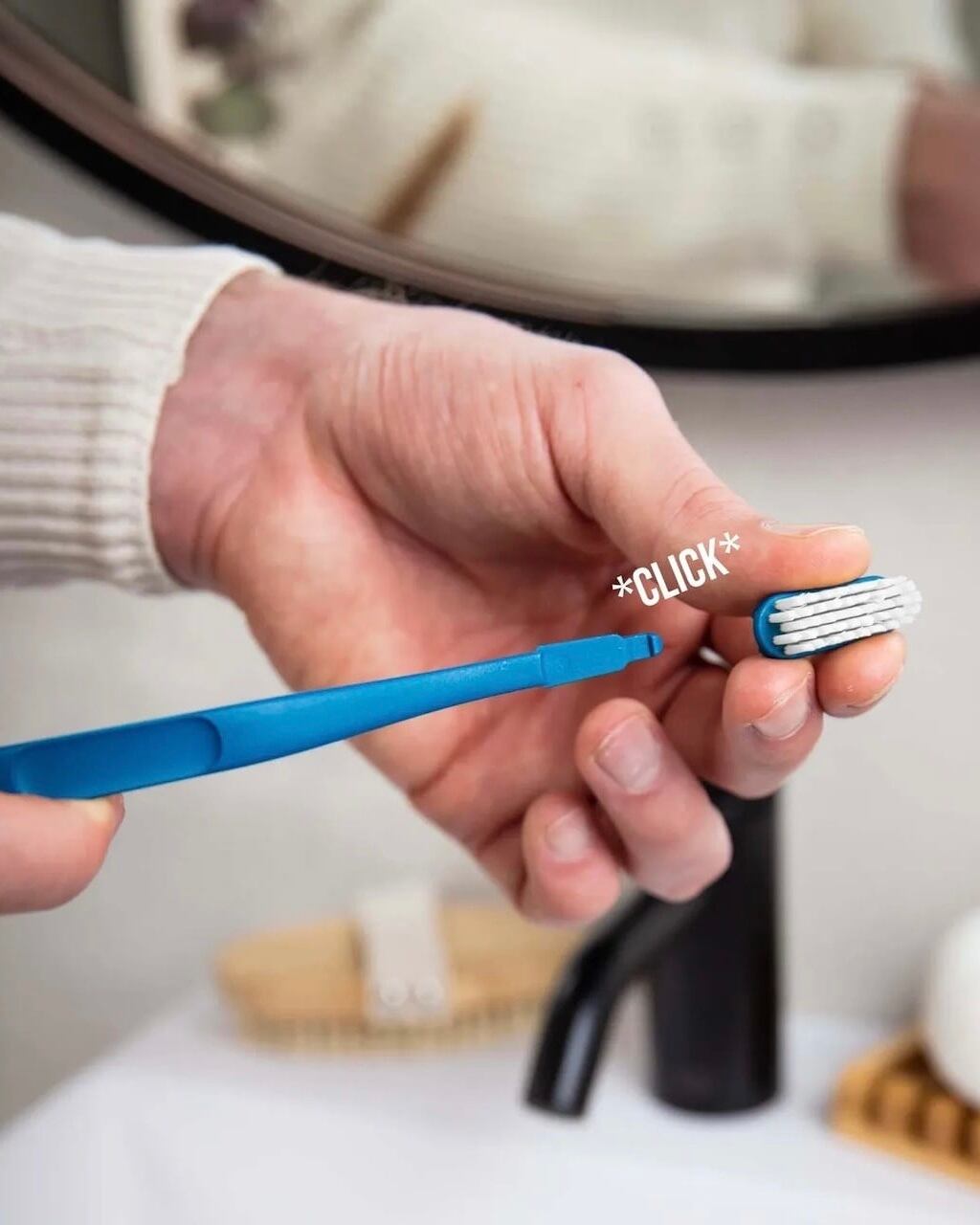 ■持続可能資源・再生資源を使用した環境にやさしい歯ブラシ。交換可能なヘッドで、プラスチック廃棄物を82%削減。