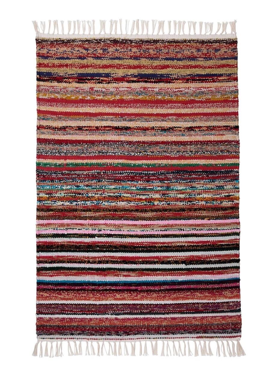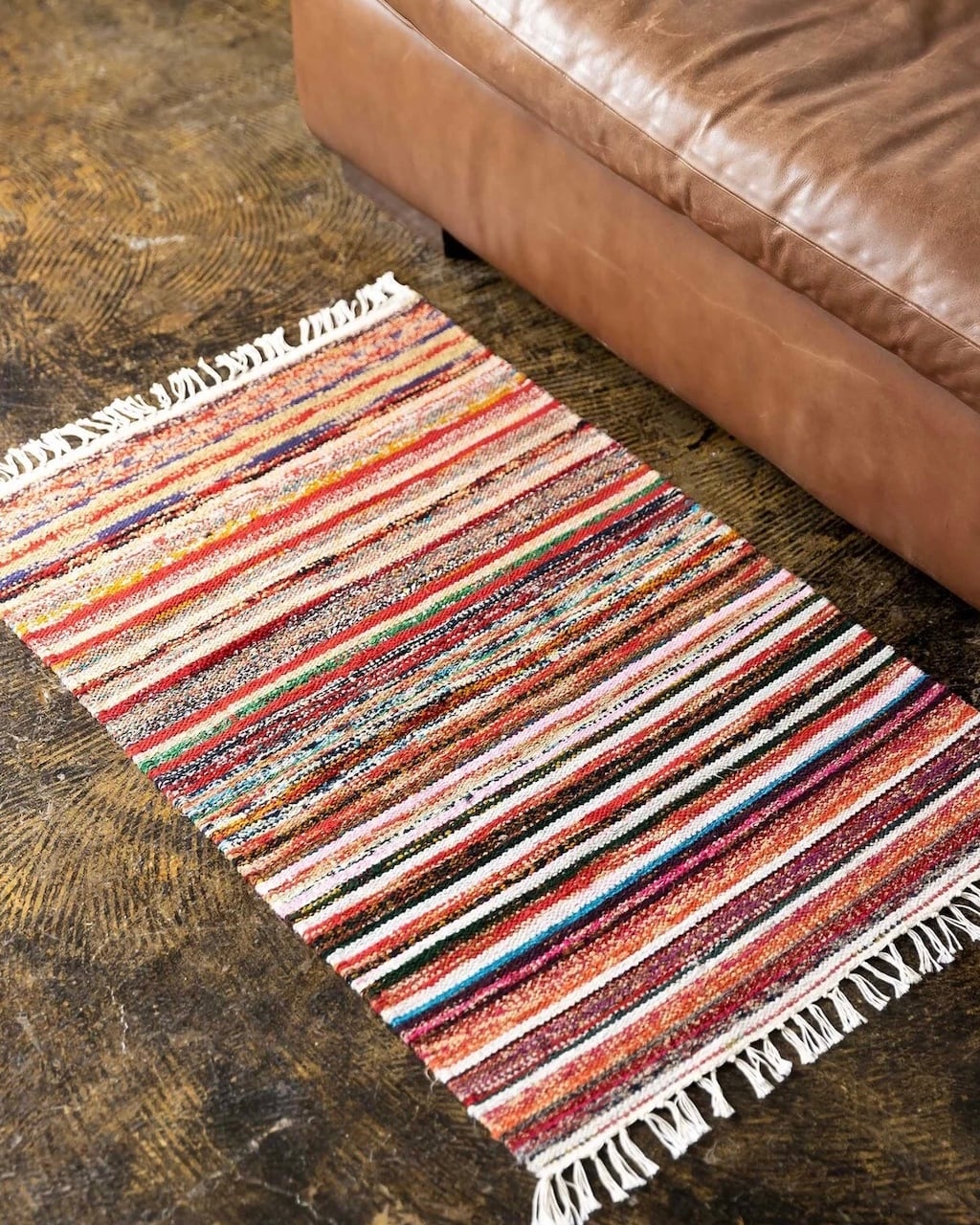 マルチカラーがお部屋に明るさをもたらすラグマットは、小さめのソファやベッドサイドなどにおすすめのサイズ感。両サイドにフリンジをあしらっています。