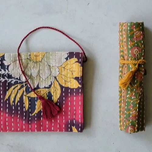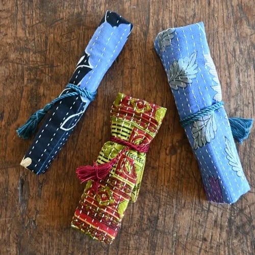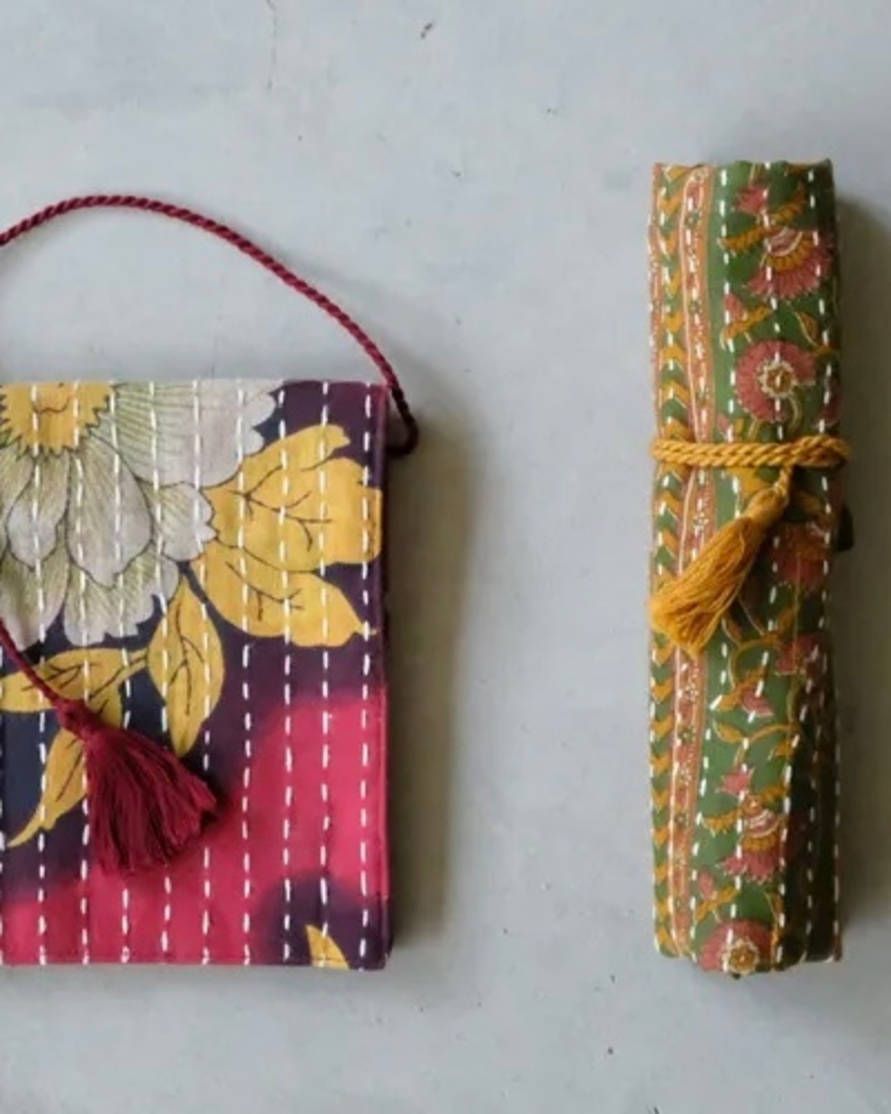 これもそれもあれも、全てかつて誰かの暮らしを彩っていたサリー生地。そんなリサイクルサリーを使ったシリーズから、旅の包みが登場しました。