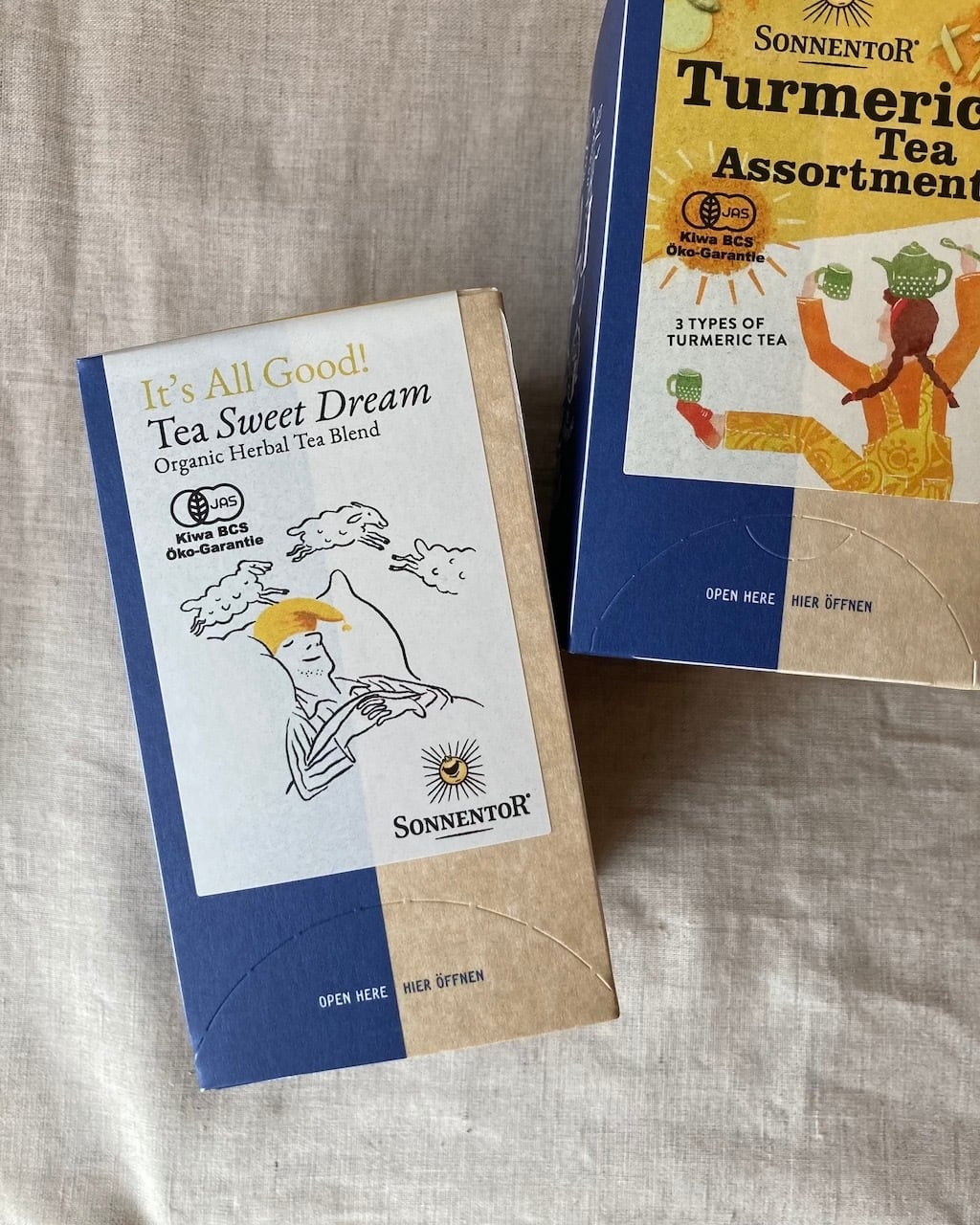 スイートドリーム:目まぐるしい一日の終わりにこの一杯。ヤロウ、レモンバーム、ラベンダーのバランスのよいブレンドにオレンジピールが加わり、あかるく穏やかな気分に。ハーブの香りをゆっくりと吸い込み、心地よい時間を楽しんだら、さあ夢の中へ。