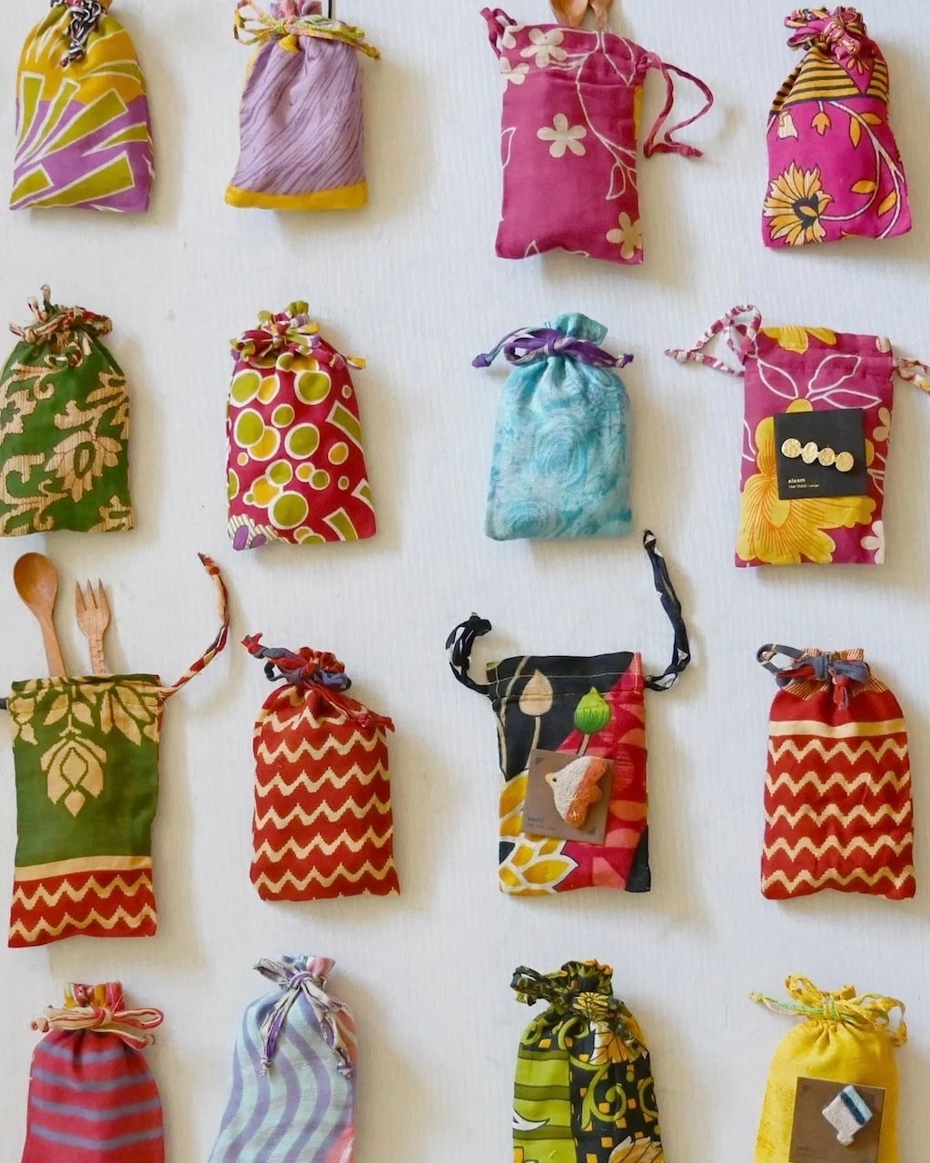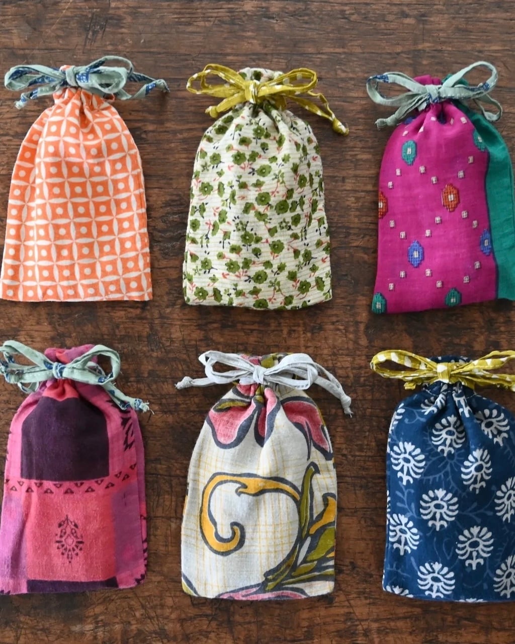 これもそれもあれも、全てかつて誰かの暮らしを彩っていたサリー生地。そんなリサイクルサリーを使った、まさに"1点もの"の小さな巾着袋です。