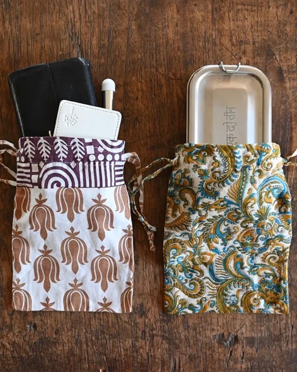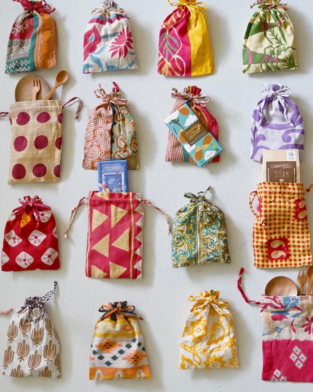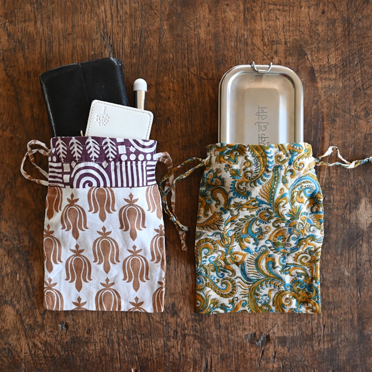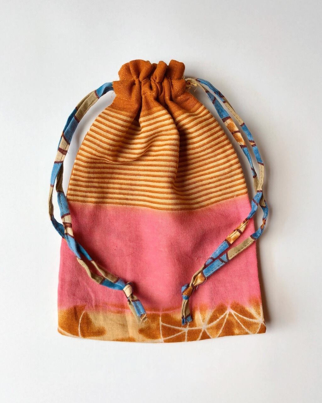 これもそれもあれも、全てかつて誰かの暮らしを彩っていたサリー生地。そんなリサイクルサリーを使った、まさに"1点もの"の小さな巾着袋です。