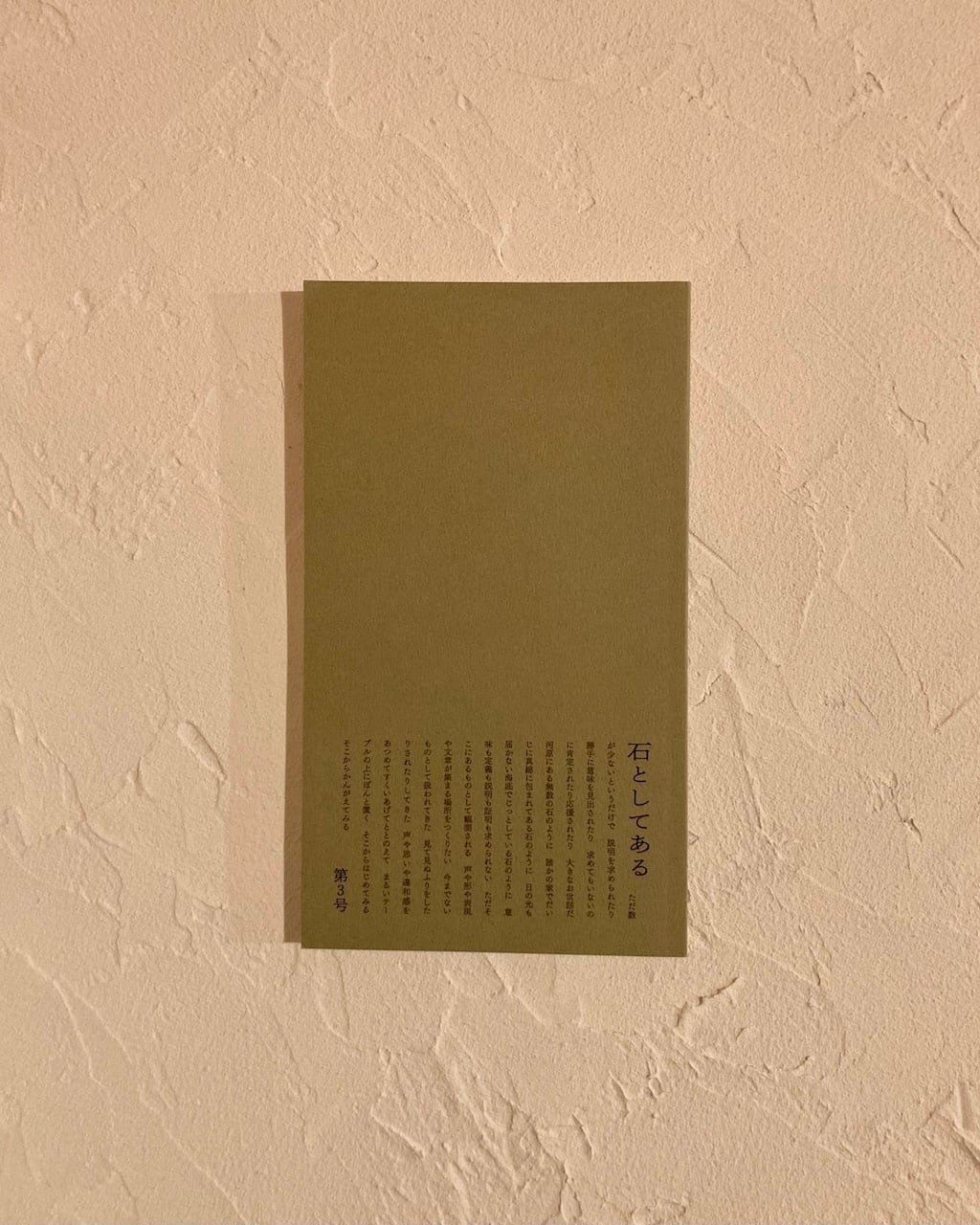 新刊書店「本屋メガホン」が発行する文芸誌「石としてある」の第3号。"意味も定義も説明も証明も求められず、ただそこにあるものとして観測される文章や表現が集まるための場所をひらく"をコンセプトに、毎号様々な寄稿者がエッセイや詩歌、日記、小説などを寄稿する。