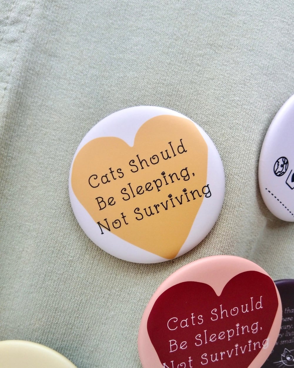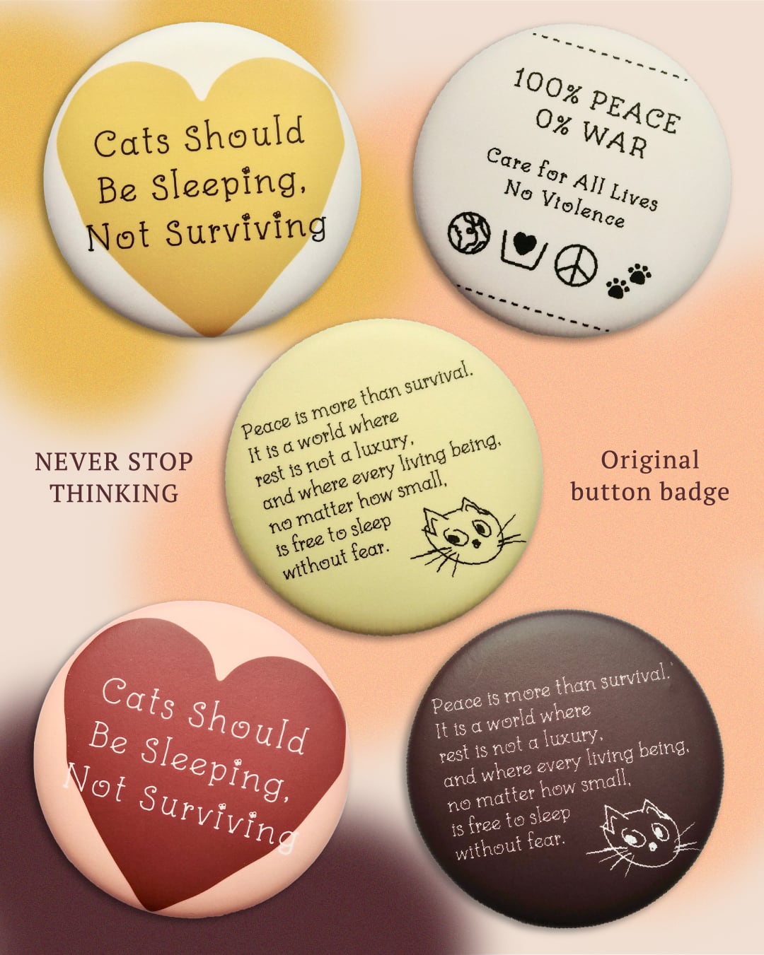 人間も猫も、すべての命のための平和を願って、メッセージ入りの缶バッジを作りました。